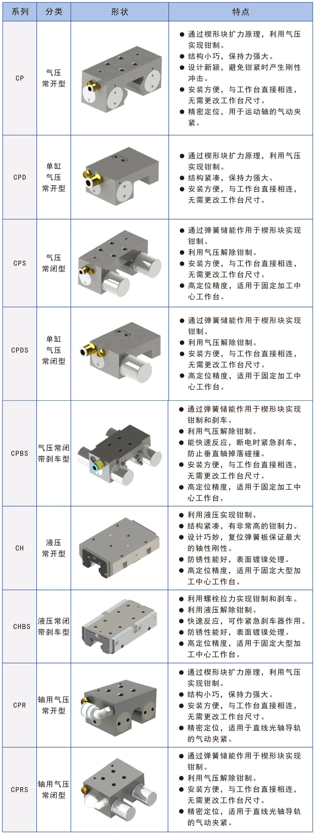 鉗制器是由鉗制器主體、執行元件、鉗制元件和接觸元件等組成,是與滾動直線導軌副、線性軸等配套使用的高性能功能部件,具有固定工作臺、精密定位、防止振動和提高剛性的功能,及具備結構緊湊、低成本及節能、提高裝置剛性及安全性的特點,帶剎車型還具有緊急剎車的作用。