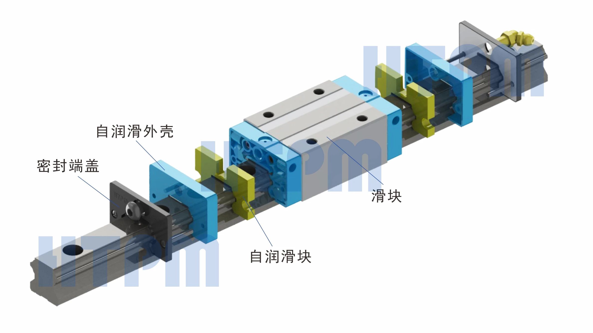 自潤滑塊是一種新型的多孔高分子材料與潤滑油脂一體成型的潤滑部件,安裝在滑塊兩端,通過與導軌溝槽面接觸,不間斷釋出新鮮的潤滑油,從而實現導軌副潤滑。